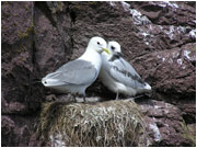 Kittiwakes are small graceful gulls, with yellow bills, black legs and silver-grey wings with all black tips. They are named after the distinctive calls they make. They build cup-like nests out of grass and mud, which they stick to the tiniest ledges on vertical cliff faces, and in which they will lay 2 or 3 eggs. Kittiwakes can be seen at St Abbs between April and August.