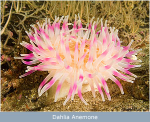 In deeper water, where the reef meets gravel you will come across some fine examples of large anemones like the colourful Dahlia anemone or the more rare, but less striking, deeplet sea anemone. In some areas brittle stars, with their small disc-like bodies and long, thin, legs, totally dominate the seabed. Present in their thousands, they form an eerie writhing carpet, each animal with an arm or two sticking up to catch food suspended in the water.